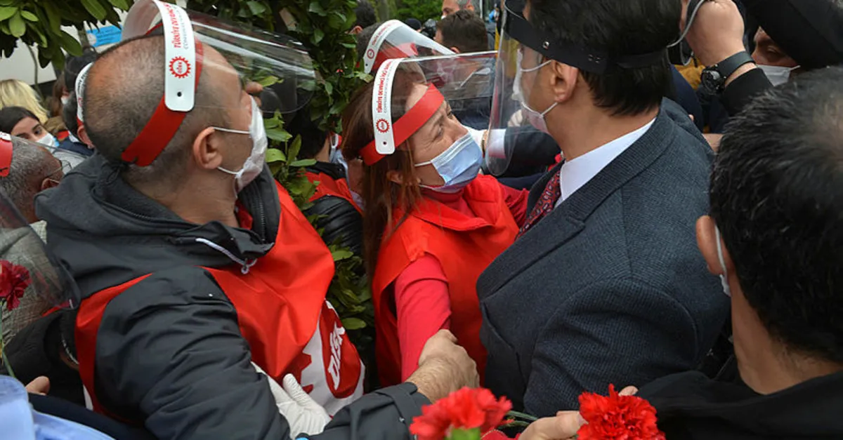 İstanbul Valiliği; DİSK Genel Merkez Binası’ndaki sendika yetkililerinin, 1 Mayıs Emek ve Dayanışma Günü kapsamında çelenk bırakmak için toplu olarak Taksim Meydanı’na yürümek istediğini, yürüyüşün sosyal mesafenin korunmasıyla ilgili kurallara uygun olmadığına yönelik uyarıya rağmen yapılmak istendiğini açıkladı. Kenan Kıran'ın haberine göre; Taksim Meydanı’na yürümekte ısrar ederek, yapılan yasal uyarıları kabul etmeyen ve görevli polis memurlarına mukavemette bulunan grubun gözaltına altına alındıktan sonra Cumhuriyet Savcılığı tarafından serbest bırakıldığı ifade edildi.