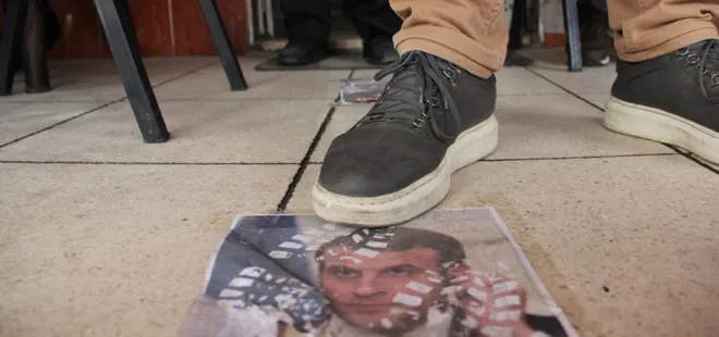 Kahvehane müşterilerinden Abdulkadir Kuru, "Bir Müslüman olarak Macron'a lanet okuduk. Macron'a tepki göstermek için fotoğrafının üzerine basıp yürüdük."