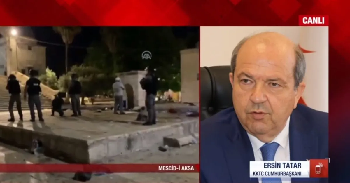 İsrail güçleri tarafından Mescid-i Aksa’ya yapılan baskın hakkında A Haber'e konuşan KKTC Cumhurbaşkanı Ersin Tatar, “Filistinli kardeşlerimize geçmiş olsun. Büyük bir üzüntüyle öğrendim.” dedi. Tatar, “Bu gece yaşananlar bize Kıbrıs'ta yaşananları hatırlattı.” şeklinde konuştu.