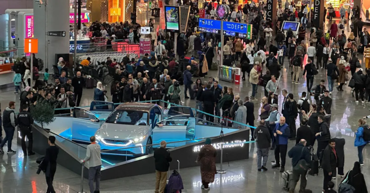 Türkiye'nin yerli ve milli otomobili olan TOGG'un SUV modeli, İstanbul Havalimanı'nda sergilenmeye başlandı. Pasaport kontrolünün arkasına kurulan standa yabancıların büyük beğenisini topladı.