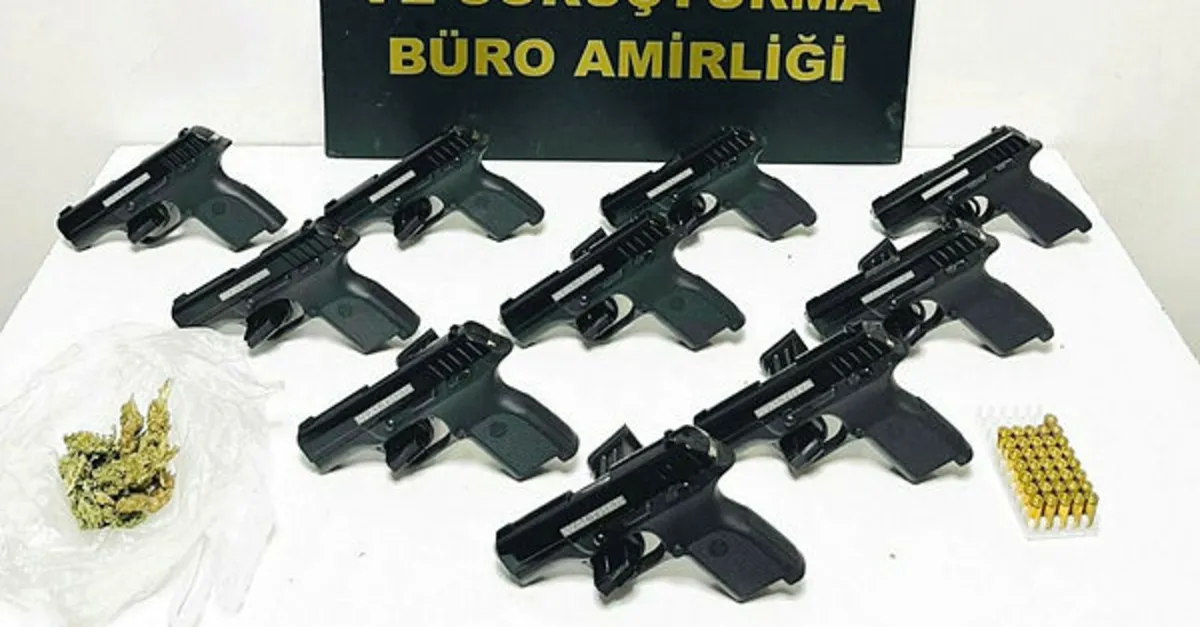 Bursa'da polis ekipleri uyuşturucu madde bulunduran şüphelinin iş yerine düzenledikleri operasyon sonucu 10 adet ruhsatsız tabanca, 36 adet fişek, 23.48 gram esrar ele geçirdi.