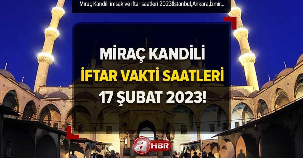 17 Şubat Miraç Kandili münasebetiyle oruç tutan vatandaşlar, iftar saatlerini araştırıyor. Miraç Kandili ezan saatleri ve iftar vakti; İstanbul, İzmir, Ankara ve Bursa başta olmak üzere 81 il için Diyanet tarafından yayımlandı. Peki, Akşam ezanı saat kaçta okunacak? İstanbul iftar saati kaçta? şte 17 Şubat 2023 Cuma Miraç Kandili orucu için ezan saatleri ve iftar vakti...