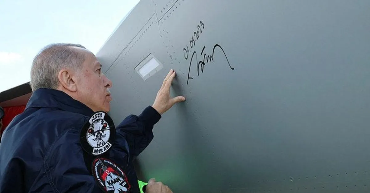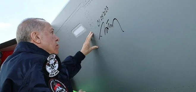 Erdoğan, Milli Muharip Uçak KAAN'ın gövdesine 1 Mayıs 2023 tarihini atıp imzaladı.