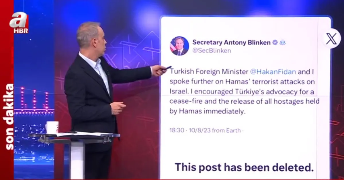 ABD Dışişleri Bakanı Antony Blinken, Dışişleri Bakanı Hakan Fidan'la görüşmesinin ardından paylaştığı ve "Türkiye'nin ateşkes çağrısını teşvik ettim" ifadelerine yer verdiği sosyal medya mesajını sildi.