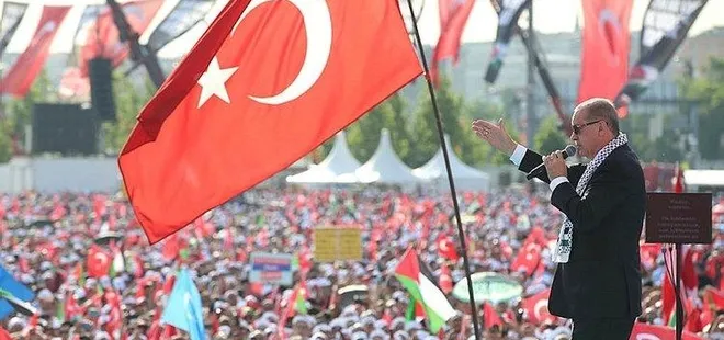 Mitinge katılanlara, Filistin davasına sahip çıkarak Gazzeli mazlumlara umut oldukları için şahsı ve milleti adına teşekkür eden Başkan Erdoğan, "Bu toprağı bize vatan olarak bırakan ecdadın tüm şehitlerini, gazilerini, kahramanlarını rahmetle anıyorum. Anadolu Selçuklu Devleti'nden Osmanlı'ya ve Cumhuriyet'e kadar vatan topraklarına hükümranlık mührümüzü vurduğumuz devletlerimizin kurulmasında ve yaşatılmasında emeği geçenleri minnetle yad ediyorum." dedi.