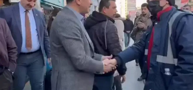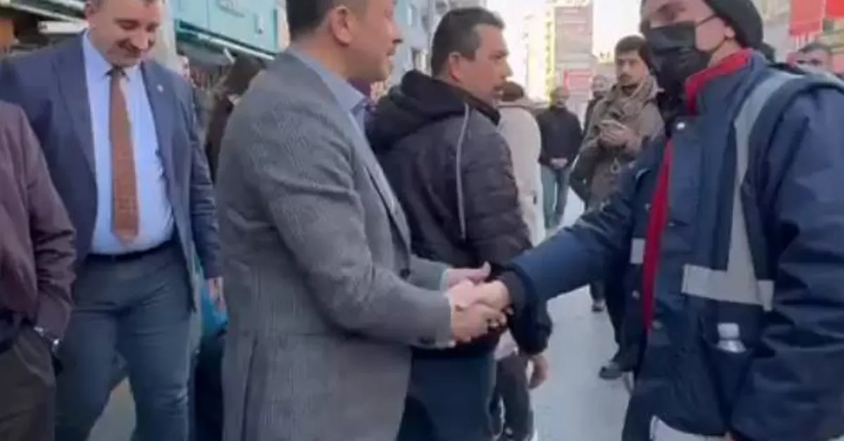 Cumhur İttifakı İzmir Büyükşehir Belediye Başkan adayı Hamza Dağ, Konak ilçesi Eşrefpaşa Caddesi'ndeki seçim çalışmaları sırasında DİSK üyesi bir belediye işçisi ile sohbet etti. Dağ, seçimi kazanmaları durumunda kimsenin işten atılmayacağını söyledi.