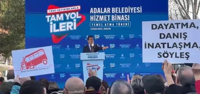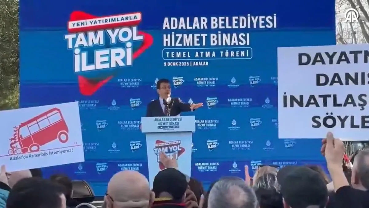 Büyükada Çınar Meydanı'ndaki programda, İBB Başkanı Ekrem İmamoğlu'nun konuşması sırasında bir grup İETT'nin Adalar'a getirdiği minibüsleri protesto etti.