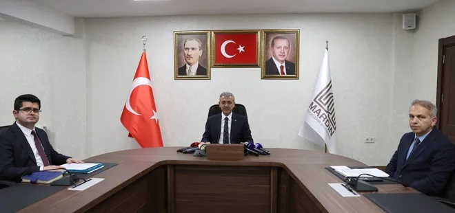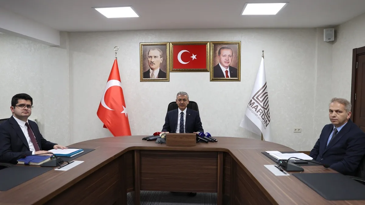Vali Akkoyun, Mardin Büyükşehir Belediyesi Genel Sekreteri Fatih Eroğlu ve MARSU Genel Müdürü Murat Erçin ile Mardin Büyükşehir Belediyesinde gazetecilere açıklamada bulundu.