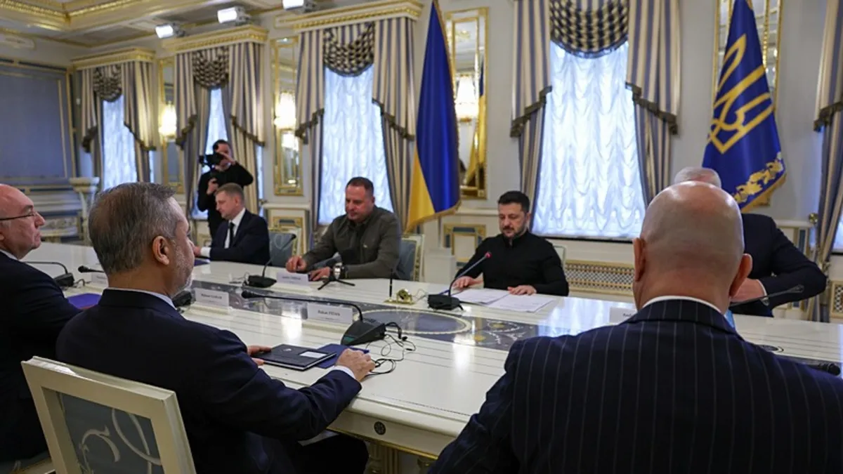 Dışişleri Bakanı Hakan Fidan'ı Kiev'deki çalışma ofisinde kabul eden Zelenskiy, Telegram hesabından görüşmeye ilişkin paylaşım yaptı.