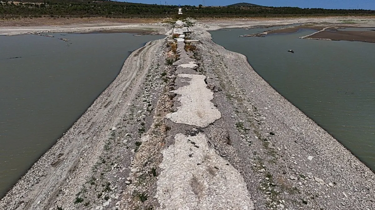 İzmir'in Çeşme ilçesindeki Alaçatı Kutlu Aktaş Barajı'nda kuraklık nedeniyle su seviyesi ciddi şekilde düştü. Su çekilince, baraj yapılmadan önce kullanılan eski İzmir-Çeşme kara yolu yeniden ortaya çıktı ve yürüyerek geçilebilecek hale geldi.