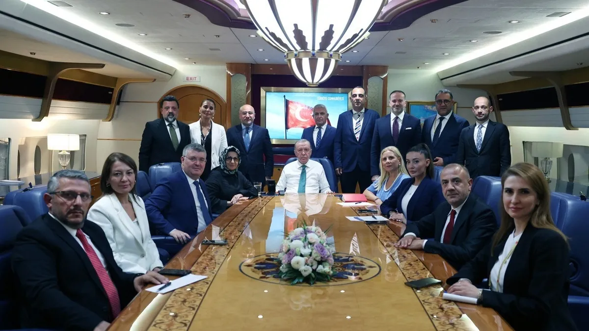 Başkan Erdoğan, Katar'dan dönüşte uçakta önce ziyaretiyle ilgili genel bir değerlendirmede bulundu ardından gazetecilerin gündeme ilişkin sorularını yanıtladı. Erdoğan, BM'nin "İki devletli çözüm" bildirgesini yorumlarken; "Türkiye'nin yıllardır her platformda savunduğu iki devletli çözüm tezi, artık küresel çoğunluğun ortak iradesi haline gelmiştir." dedi. İsrail'in "vadedilmiş topraklar" anlayışıyla Orta Doğu'yu ateşe atmasına da değinen Başkan Erdoğan, "İsrail'i yönetenler kendi radikal anlayışlarını, faşist bir ideolojiye dönüştürmüş bir cinayet şebekesinden başka bir şey değil." ifadesini kullandı. İşte Başkan Erdoğan'ın genel değerlendirmesi ve sorulan sorulara yanıtları...