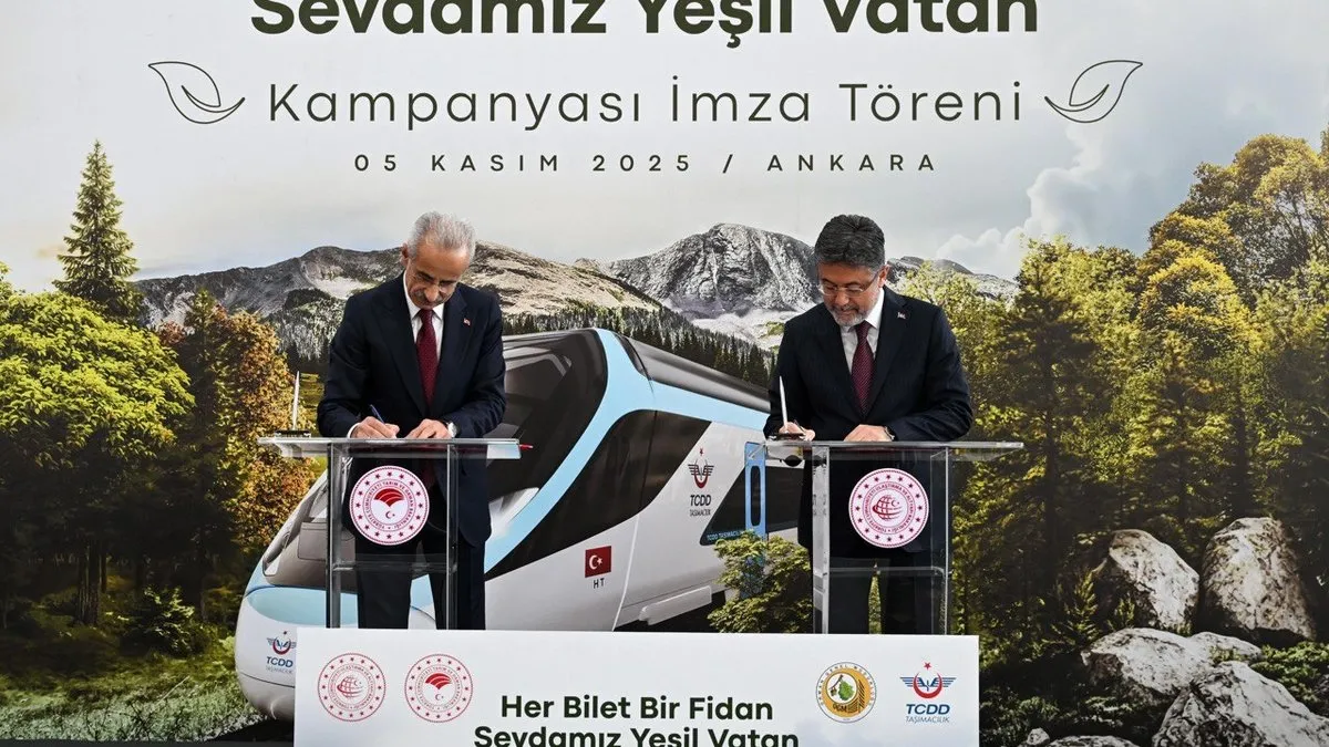 Ulaştırma ve Altyapı Bakanlığı ile Tarım ve Orman Bakanlığı arasında “Her Bilet Bir Fidan Sevdamız Yeşil Vatan Kampanyası” için imzalar atıldı. Bakan Uraloğlu, “1 yıl boyunca yüksek hızlı trenlerimizle seyahat eden her yolcumuz adına bir fidan dikeceğiz. Bu hatlarımızın genelinde yıllık ortalama 13 milyon yolcumuzun seyahat ettiğini düşündüğümüzde 13 milyon fidanı toprakla buluşturacağız” dedi.