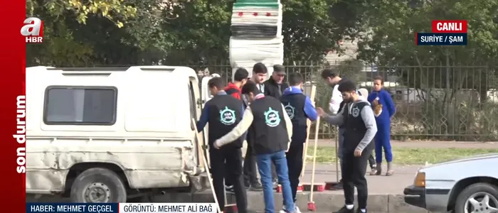 Bir taraftan da gönüllü gençler var burada. Şam’da sokakların temizliğini yapıyorlar.