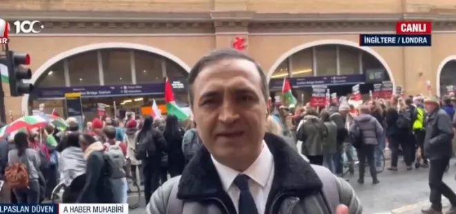 A Haber muhabiri Alpaslan Düven, İngiltere'nin başkenti Londra'da Filistin'e destek gösterilerini canlı yayında saniye saniyesine aktardı.