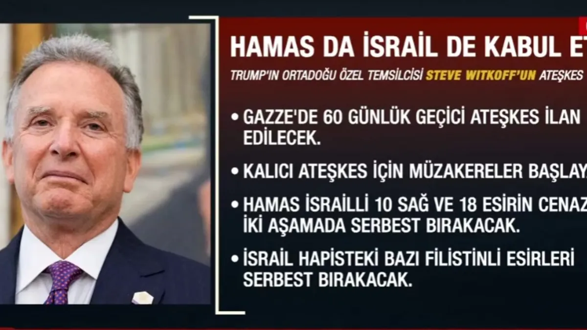 7 Ekim 2023'ten bu yana devam eden İsrail'in Gazze'ye yönelik saldırılarında ateşkes sürecine ilişkin yeni bir gelişme yaşandı. İsrail basınından akşam saatleri yapılan açıklamada İsrail Başbakanı Netanyahu'nun ABD Başkanı Trump'ın ve Orta Doğu Özel Temsilcisi Steve Witkoff'un Gazze'de ateşkes önerisinin kabul edildiğini açıklamasının ardından gözler Hamas'a çevrildi.
