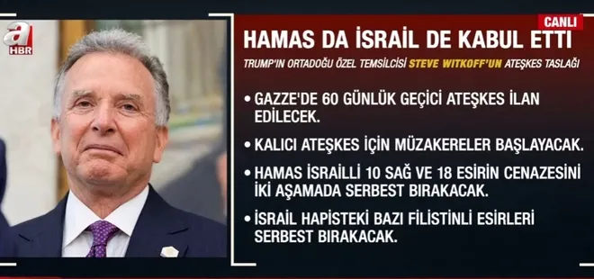 ABD Başkanı Trump ve Orta Doğu Özel Temsilcisi Steve Witkoff'un Gazze'ye yönelik ateşkes önerisine ilişkin tasarı İsrail tarafından kabul edildi. Anlaşma sürecine ilişkin ateşkesin kalıcı olup olmayacağı merak konusu olurken A Haber canlı yayınında gazeteci Abdulkadir Selvi 13 maddelik ateşkes anlaşmasına yönelik maddeleri açıkladı. Anlaşma maddelerinde 60 gün süreyle ateşkesin sağlanması, insani yardım, İsrail'in Gazze'den geri çekilmesi ve esir takasına yönelik kapsamlı detaylar yer aldı. Öte yandan Banu El'in sunduğu Arka Plan programına katılan uzmanlar ateşkes anlaşması ele alarak değerlendirmelerde bulundu.