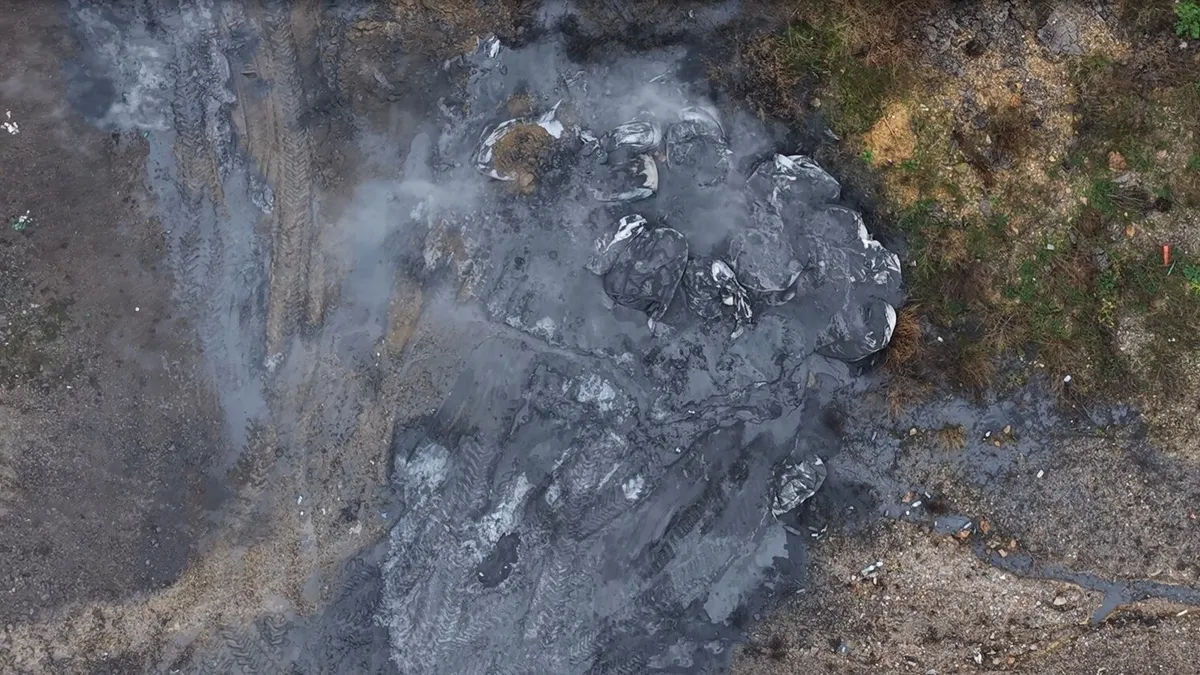 Koyu renkli ve çuvallanmış halde bulunan maddelerin hala aktif olduğunu belirten Kuşkapan, "Şu anda bu noktada yoğun bir kokunun devam ettiğini, çuvallanmış koyu renkli o maddeyi ve atık parçalarını hala görebiliyoruz" ifadelerini kullandı.