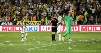 Soma'daki maden faciasında hayatını kaybedenlere adanan Süper Kupa finali öncesi yapılan fair-play çağrıları havada kaldı. 19 Mayıs Stadı yine istenmeyen görüntülere sahne oldu. G.Saraylı taraftarlar, F.Bahçe'nin her kornerinde atışı kullanan oyuncuya yabancı madde attı. F.Bahçe tribünlerinden de karşılık geldi. F.Bahçe Asbaşkanı Deniz Tolga Aytöre, devre arasında temsilciyi, "Şimdi Volkan o kaleye geçecek, önlem alın" diye uyardı. Nitekim sarı-kırmızılılar, ikinci yarıda Volkan'ı pet şişe yağmuruna tuttu. Kamil Abitoğlu oyunu durdurup, anons yaptırdı. Muslera ve Melo, taraftarların önüne gidip 'atmayın' diye uyardı.