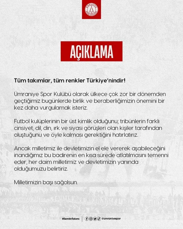 Kulüpten yapılan açıklamada, "Futbola siyaset sokma çabası içinde olanları şiddetle kınıyoruz. Devletimizin ve milletimizin sonuna kadar yanındayız" denildi.