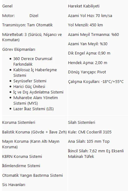 Aracın ateş gücünü ise yüksek basınçlı 105 mm Cockerill topu entegre edilmiş ve gelişmiş bir otomatik doldurucuya sahip CMI Cockerill 3105 kulesi sağlıyor. Bu kule sayesinde KAPLAN MT, düşük ağırlığına rağmen, yüksek tahrip gücüne ulaşıyor.