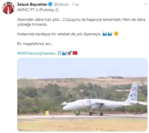 Açıklamada görüşlerine yer verilen Selçuk Bayraktar, "Bugün Bayraktar AKINCI Prototip 2 ile Orta İrtifa Sistem Tanımlama uçuşumuzu gerçekleştirdik. Vatanımıza, milletimize hayırlı ve uğurlu olsun." ifadelerini kullandı.