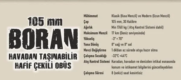 1720 kg ağırlığa 105 mm çap ve 30 kalibre namluya sahip Boran, -3/+70 derece yükseliş açısı ve sağ ve sol 8 derecelik yanca atış yapabilme özelliklerine sahip.