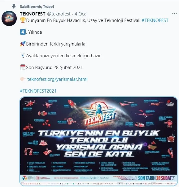 TEKNOFEST Havacılık, Uzay ve Teknoloji Festivali Türkiye Teknoloji Takımı Vakfı ve Sanayi ve Teknoloji Bakanlığı yürütücülüğünde, Türkiye'nin önde gelen teknoloji şirketleri, kamu, medya kuruluşları ve üniversitelerin de olduğu 67 paydaş kurum ile birlikte düzenleniyor. 21-26 Eylül tarihleri arasında yeniden İstanbul'da gerçekleşecek olan Havacılık, Uzay ve Teknoloji Festivali TEKNOFEST'in bir parçası olmak ve başvuru gerçekleştirmek için "teknofest.org/yarismalar.html" adresini ziyaret edilebiliyor.