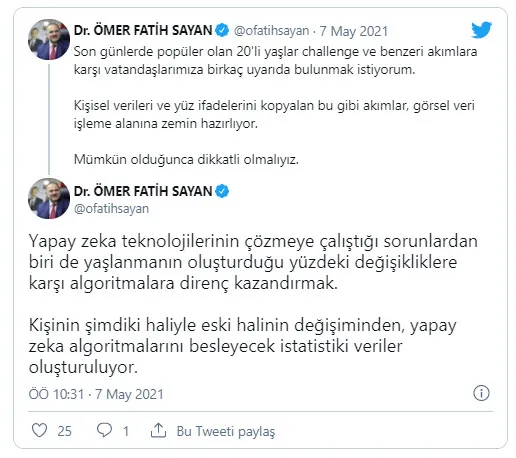 Ulaştırma ve Altyapı Bakan Yardımcısı Ömer Fatih Sayan, Twitter hesabından yaptığı paylaşımda, "20'li yaşlar challenge" ve benzeri akımların son günlerde popüler olduğuna dikkati çekerek, kişisel verileri ve yüz ifadelerini kopyalan bu gibi akımların, görsel veri işleme alanına zemin hazırladığını bildirdi.