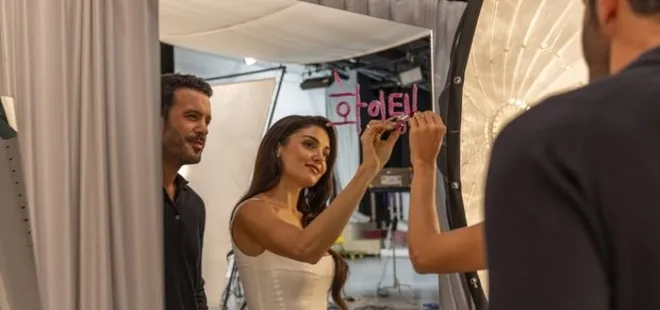 Yayınlanan iki farklı konseptteki afişleriyle beğeni toplayan Arduç ve Erçel, çekim arasında Kore dizilerinde sıkça kullanılan motivasyon sözü "Hwaiting" aynaya yazıp birlikte poz verdi.
