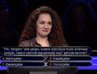 ATV ekranlarının fenomen bilgi yarışması programı Kim Milyoner Olmak İster'in 852.yeni bölümüne TDK, hangisini ''pille çalışan, kulaklık aracılığıyla müzik dinlemeye yarayan, insanın üzerinde taşıyabileceği teyp'' şeklinde tanımlar? sorusu damga vurdu. Bakın, yarışmacı Ezgi Hanım, 60.000 TL'lik soruya ne cevap verdi.