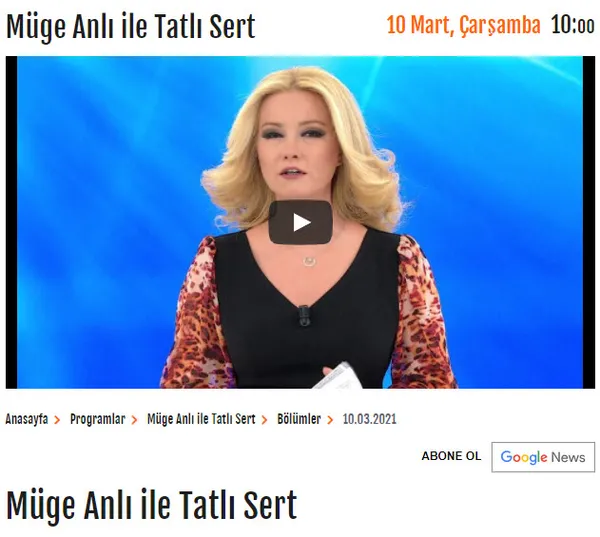 Hafta içi her gün ATV ekranında yayınlanan Müge Anlı ile Tatlı Sert programında bugün (10 Mart 2021 Çarşamba) ne oldu? Araştırmacı gazeteci Müge Anlı'nın sunduğu programda kayıplar bulunuyor, yıllardır sır olmuş cinayetler aydınlığa çıkarılıyor.