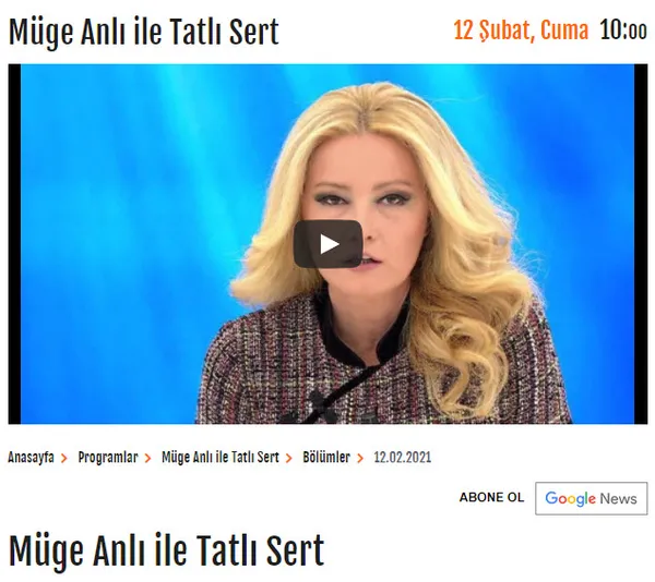 Hafta içi her gün ATV ekranında yayınlanan Müge Anlı ile Tatlı Sert programında bugün (12 Şubat 2021 Cuma) ne oldu? Araştırmacı gazeteci Müge Anlı'nın sunduğu programda kayıplar bulunuyor, yıllardır sır olmuş cinayetler aydınlığa çıkarılıyor.