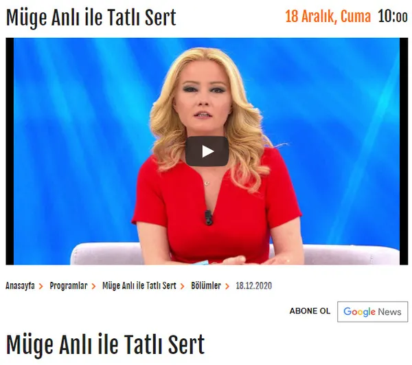 Hafta içi her gün ATV ekranında yayınlanan Müge Anlı ile Tatlı Sert programında bugün (18 Aralık 2020 Cuma) ne oldu? Araştırmacı gazeteci Müge Anlı'nın sunduğu programda kayıplar bulunuyor, yıllardır sır olmuş cinayetler aydınlığa çıkarılıyor.