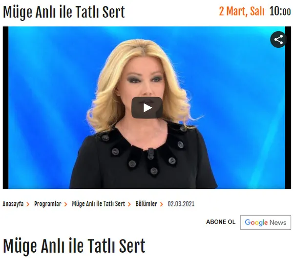 Hafta içi her gün ATV ekranında yayınlanan Müge Anlı ile Tatlı Sert programında bugün (2 Mart 2021 Salı) ne oldu? Araştırmacı gazeteci Müge Anlı'nın sunduğu programda kayıplar bulunuyor, yıllardır sır olmuş cinayetler aydınlığa çıkarılıyor.