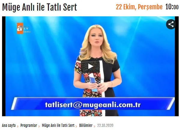 Hafta içi her gün ATV ekranında yayınlanan Müge Anlı ile Tatlı Sert programında bugün (22 Ekim 2020 Perşembe) ne oldu? Araştırmacı gazeteci Müge Anlı'nın sunduğu programda kayıplar bulunuyor, yıllardır sır olmuş cinayetler aydınlığa çıkarılıyor.