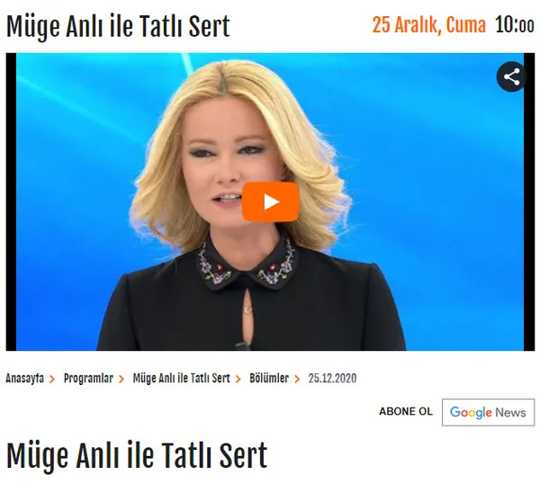 Hafta içi her gün ATV ekranında yayınlanan Müge Anlı ile Tatlı Sert programında bugün (25 Aralık 2020 Cuma) ne oldu? Araştırmacı gazeteci Müge Anlı'nın sunduğu programda kayıplar bulunuyor, yıllardır sır olmuş cinayetler aydınlığa çıkarılıyor.