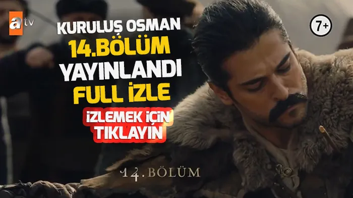 ATV ekranında yayınlanan ve çarşamba akşamlarına damga vuran dizi "Kuruluş Osman" yayınlanan 14. son yeni bölümüyle yine diziseverlerin vazgeçilmezi oldu. Son yayınlanan bölüm sosyal medyada #TürkOlmak etiketiyle ise kısa sürede gündem oldu. Burak Özçivit'in Osman Bey karakterini canlandırdığı dizinin son bölümünde neler oldu? Kuruluş Osman 14. yeni bölümünü kesintisiz tek parça full videosunu ahaber.com.tr sayfamız üzerinden yeniden izleyebilirsiniz. Öte yandan "Kuruluş Osman 15. yeni bölüm fragman videosu yayınlandı mı?" sorusu yanıt buldu. 18 Mart 2020 Çarşamba akşamı yayınlanacak olan yeni bölüm fragman videosunu da haberimizin içerisinde izleyebilirsiniz.