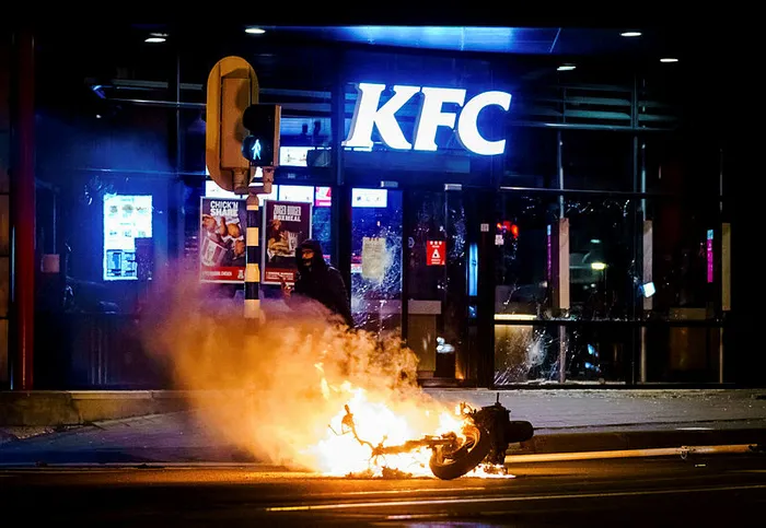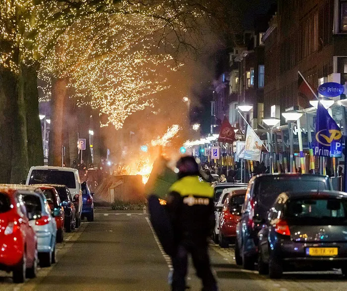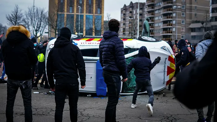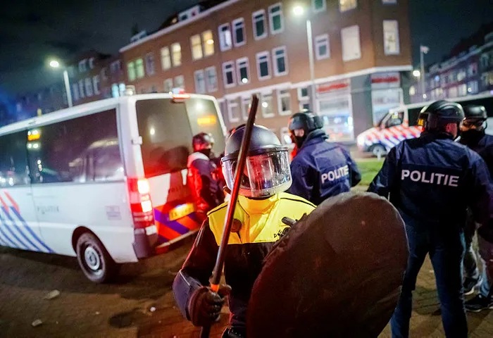 Rotterdam'ın güneyinde yapılan protestoda polise havai fişek ve taşlarla saldıran eylemciler mağazaları yağmaladı. Polis bürosuna havai fişeklerle saldırı düzenlendi.