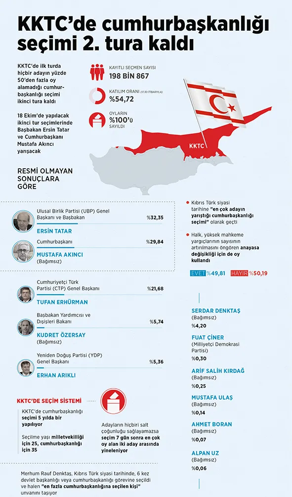 KKTC'de 18 Ekim'de düzenlenecek Cumhurbaşkanlığı seçiminin ikinci turunda mevcut Başbakan Tatar ile mevcut Cumhurbaşkanı Mustafa Akıncı yarışacak.