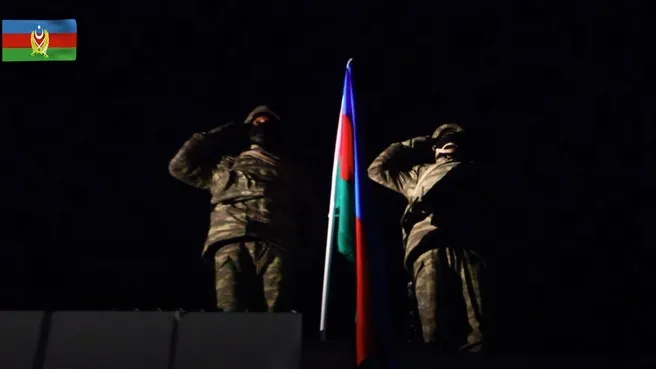 Azerbaycan ordusu, 28 yıl sonra Ermenistan işgalinden kurtarılan Laçın'a, Azerbaycan bayrağı dikti.