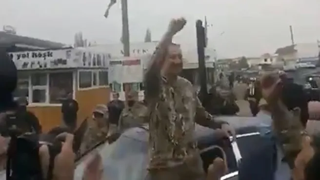 Sosyal medyada paylaşılan görüntülerde, askeri üniforma giyen Aliyev'in Fuzuli ilinin yerleşim birimlerinden birinde halk tarafından coşkuyla karşılandığı görüldü.