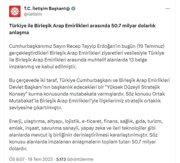 TÜRKİYE İLE BİRLEŞİK ARAP EMİRLİKLERİ ARASINDA 50.7 MİLYAR DOLARLIK ANLAŞMA