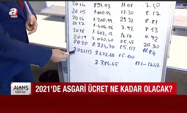 Milyonlarca emekli ve çalışanın gözü kulağı bu haberde... 2021 yılında asgari ücrete ne kadar zam yapılacak? Takvim Gazetesi Ekonomi Müdürü Faruk Erdem milyonlarca kişinin yanıtını merakle beklediği soruya ilgili A Haber canlı yayınında yanıt verdi.