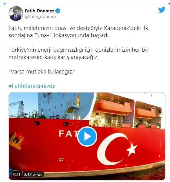 Bakan Fatih Dönmez Twitter'dan duyurdu! Fatih gemisi Tuna-1'de sondaja başladı