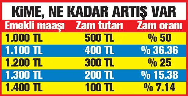 Maaşı bin 100 lira olan 400 lira, yani yüzde 36.36; bin 200 lira olan 300 lira, yani yüzde 25; bin 300 lira olan 200 lira, yani yüzde 15.38; bin 400 lira olan 100 lira, yani yüzde 7.14 zam alacak.