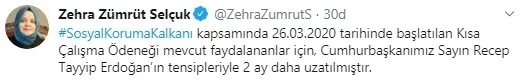 Aile, Çalışma ve Sosyal Hizmetler Bakanı Selçuk, sosyal paylaşım sitesi Twittir hesabından yaptığı paylaşımda, "SosyalKorumaKalkanı kapsamında 26.03.2020 tarihinde başlatılan Kısa Çalışma Ödeneği mevcut faydalananlar için, Cumhurbaşkanımız Sayın Recep Tayyip Erdoğan'ın tensipleriyle 2 ay daha uzatılmıştır" ifadelerine yer verdi.