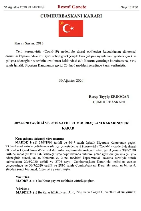 Yeni Koronavirüs (Kovid-19) Nedeniyle Dışsal Etkilerden Kaynaklanan Dönemsel Durumlar Kapsamındaki Zorlayıcı Sebep Gerekçesiyle Kısa Çalışma Uygulanan İşyerleri İçin Kısa Çalışma Ödeneğinin Süresinin Uzatılması Hakkındaki Cumhurbaşkanı Kararı, Resmi Gazete'nin bugünkü sayısında yayımlandı.