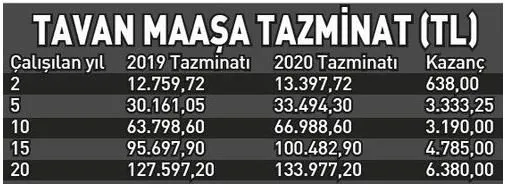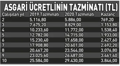 Örneğin 10 yıldır çalışan bir asgari ücretli işçinin kıdem tazminatı 2019'da 25.584 lira olurken, bu rakam 2020'de 29.430 liraya çıkacak. Böylece çalışan 3 bin 846 lira daha fazla para alacak.
