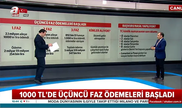Son dakika haberi... Koronavirüs salgınıyla mücadele kapsamında hükümetten vatandaşlara ekonomik yardımlar devam ediyor. Sosyal destekler kapsamında 3. faz ödemeleri de başladı.Düzenli geliri olmayan vatandaşlara, günlük yevmiye ile çalışırken işsiz kalıp gelirinden olan vatandaşlara 1000 TL sosyal destek yardımı yapılıyor. Kimler alıyor? Şartlar neler? Başvuru nasıl yapılıyor? TC kimlik numarasının sonuna göre hangi günler başvuru yapılabiliyor? Takvim Gazetesi Ekonomi müdürü Faruk Erdem, A Haber canlı yayınında detayları anlattı.