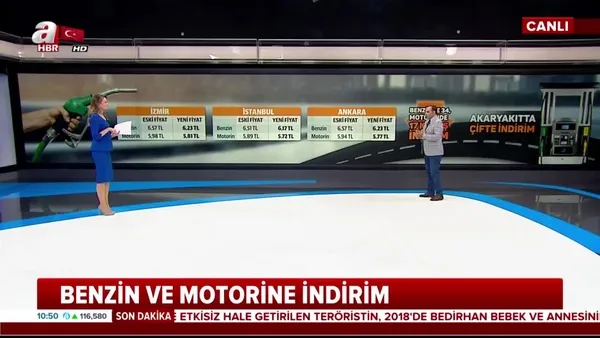 Son dakika haberi... Motorinin litre fiyatına bu gece yarısından geçerli olmak üzere 17 kuruş, benzinin litre fiyatına ise 12 kuruş indirim yapılacak. Peki İstanbul, Ankara ve İzmir'de benzin ve motorin fiyatları ne kadar oldu? Takvim Gazetesi ekonomi müdürü Faruk Erdem canlı yayında anlattı.